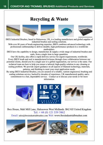 16 CONVEYOR AND TROMMEL BRUSHES Additional Products and Services Recycling & Waste IBEX Industrial Brushes, based in Halesowen, UK, is a leading manufacturer and global supplier of industrial brushes and sealing solutions. With over 80 years of brush engineering expertise, IBEX combines advanced technology with professional craftsmanship to deliver durable, high-performance products to a worldwide marketplace. IBEX have the capability to design, manufacture & supply a wide range of industrial brushes and seals, from a single item to large quantities. Our UK facility, also offers a rapid delivery service for urgent requirements, worldwide. Every IBEX brush and seal is manufactured in-house through close collaboration between our potential clients, should you be a single user or a global organisation, our service is the same. Our technical team are here to help you ensure a tailored, high-quality solution to any cleaning or sealing problem. We provide expert guidance on all aspects of filament technology, materials, patterns, and finishing to meet your exact application needs. By using IBEX Industrial Brushes, you are assured of a reliable, custom-engineered, brushing and sealing solutions service, backed by decades of experience, UK manufactured quality, and a commitment to a fast, dependable service. Contact us to discuss your needs or for more information. Ibex House, Malt Mill Lane, Halesowen West Midlands. B62 8JJ United Kingdom Tel: + 44 (0) 121 559 3862 Email: sales@ibexindustrialbrushes.com Web: www.ibexindustrialbrushes.com