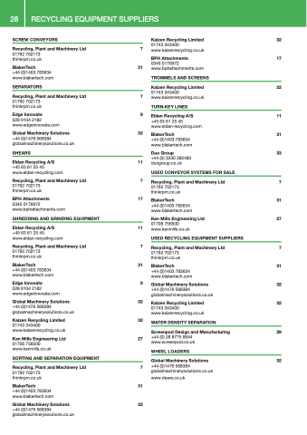28 RECYCLING EQUIPMENT SUPPLIERS SCREW CONVEYORS Recycling, Plant and Machinery Ltd 01792 702173 thinkrpm.co.uk BlakerTech +44 (0)1403 783634 www.blakertech.com SEPARATORS Recycling, Plant and Machinery Ltd 01792 702173 thinkrpm.co.uk Edge Innovate 028 9104 2182 www.edgeinnovate.com Global Machinery Solutions +44 (0)1476 568384 globalmachinerysolutions.co.uk SHEARS Eldan Recycling A/S +45 63 61 25 45 www.eldan-recycling.com Recycling, Plant and Machinery Ltd 01792 702173 thinkrpm.co.uk BPH Attachments 0345 0176972 www.bphattachments.com SHREDDING AND GRINDING EQUIPMENT Eldan Recycling A/S +45 63 61 25 45 www.eldan-recycling.com Recycling, Plant and Machinery Ltd 01792 702173 thinkrpm.co.uk BlakerTech +44 (0)1403 783634 www.blakertech.com Edge Innovate 028 9104 2182 www.edgeinnovate.com Global Machinery Solutions +44 (0)1476 568384 globalmachinerysolutions.co.uk Kaizen Recycling Limited 01743 343400 www.kaizenrecycling.co.uk Ken Mills Engineering Ltd 01706 756500 www.kenmills.co.uk SORTING AND SEPARATION EQUIPMENT Recycling, Plant and Machinery Ltd 01792 702173 thinkrpm.co.uk BlakerTech +44 (0)1403 783634 www.blakertech.com Global Machinery Solutions +44 (0)1476 568384 globalmachinerysolutions.co.uk Kaizen Recycling Limited 32 01743 343400 www.kaizenrecycling.co.uk BPH Attachments 17 0345 0176972 www.bphattachments.com TROMMELS AND SCREENS Kaizen Recycling Limited 32 01743 343400 www.kaizenrecycling.co.uk TURN-KEY LINES 9 32 11 7 17 11 7 31 9 32 32 27 7 31 32 7 31 7 Eldan Recycling A/S 11 +45 63 61 25 45 www.eldan-recycling.com BlakerTech 31 +44 (0)1403 783634 www.blakertech.com Duo Group 33 +44 (0) 3330 382483 duogroup.co.uk USED CONVEYOR SYSTEMS FOR SALE Recycling, Plant and Machinery Ltd 7 01792 702173 thinkrpm.co.uk BlakerTech 31 +44 (0)1403 783634 www.blakertech.com Ken Mills Engineering Ltd 27 01706 756500 www.kenmills.co.uk USED RECYCLING EQUIPMENT SUPPLIERS Recycling, Plant and Machinery Ltd 7 01792 702173 thinkrpm.co.uk BlakerTech 31 +44 (0)1403 783634 www.blakertech.com Global Machinery Solutions 32 +44 (0)1476 568384 globalmachinerysolutions.co.uk Kaizen Recycling Limited 32 01743 343400 www.kaizenrecycling.co.uk WATER DENSITY SEPARATION Screenpod Design and Manufacturing 29 +44 (0) 28 8775 8944 www.screenpod.co.uk WHEEL LOADERS Global Machinery Solutions 32 +44 (0)1476 568384 globalmachinerysolutions.co.uk www.deere.co.uk
