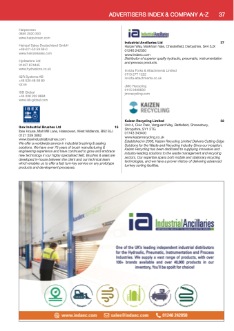 ADVERTISERS INDEX & COMPANY A-Z 37 Harpscreen 0845 2020 300 www.harpscreen.com Heinzel Sales Deutschland GmbH +49-611-50 59 69-0 www.heinzelsales.com Hydrastore Ltd 01427 874445 www.hydrastore.co.uk IQR Systems AB +46 520-48 58 80 iqr.se ISB Global +44 208 232 8884 www.isb-global.com Ibex House, Malt Mill Lane, Halesowen, West Midlands, B62 8JJ 0121 559 3862 www.ibexindustrialbrushes.com We offer a worldwide service in industrial brushing & sealing solutions. We have over 75 years of brush manufacturing & engineering experience and have continued to grow and embrace new technology in our highly specialised field. Brushes & seals are developed in-house between the client and our technical team which enables us to offer a fast turn-key service on any prototype products and development processes. Industrial Ancillaries Ltd 37 Harper Way, Markham Vale, Chesterfield, Derbyshire, S44 5JX 01246 242050 www.indanc.com Distributor of superior quality hydraulic, pneumatic, instrumentation and process products. Invicta Forks & Attachments Limited 0113 277 1222 invicta-attachments.co.uk JMC Recycling 0115 9409630 jmcrecycling.com Ibex Industrial Brushes Ltd 16 Unit 4, Civic Park, Vanguard Way, Battlefield, Shrewsbury, Shropshire, SY1 3TG 01743 343400 www.kaizenrecycling.co.uk Kaizen Recycling Limited 32 Established in 2006, Kaizen Recycling Limited Delivers Cutting-Edge Solutions for the Waste and Recycling Industry Since our inception, Kaizen Recycling has been dedicated to supplying innovative and industry-leading solutions to the waste management and recycling sectors. Our expertise spans both mobile and stationary recycling technologies, and we have a proven history of delivering advanced turnkey sorting facilities.