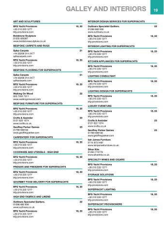 ART AND SCULPTURES BFG Yacht Provisions +30 210 220 1277 bfg-provisions.com Boldstone Sculpture 01225 830367 www.boldstonesculpture.co.uk BESPOKE CARPETS AND RUGS Sylka Carpets +44 (0)208 314 2477 sylkacarpets.com BFG Yacht Provisions +30 210 220 1277 bfg-provisions.com BESPOKE FLOORING FOR SUPERYACHTS Sylka Carpets +44 (0)208 314 2477 sylkacarpets.com BFG Yacht Provisions +30 210 220 1277 bfg-provisions.com Walking On Wood 020 7352 7311 www.walkingonwood.com BESPOKE FURNITURE FOR SUPERYACHTS BFG Yacht Provisions +30 210 220 1277 bfg-provisions.com Crofts & Assinder 0121 622 1074 www.crofts.co.uk Geoffrey Parker Games 01799 599100 www.geoffreyparker.com CARPENTERY FOR SUPERYACHTS BFG Yacht Provisions +30 210 220 1277 bfg-provisions.com COOKWARE AND UTENSILS - HIGH END BFG Yacht Provisions +30 210 220 1277 bfg-provisions.com FRIDGES AND FREEZERS FOR SUPERYACHTS BFG Yacht Provisions +30 210 220 1277 bfg-provisions.com GOURMET FOOD DELIVERY FOR SUPERYACHTS BFG Yacht Provisions +30 210 220 1277 bfg-provisions.com HIGH END FABRICS AND LINENS Outliners Specialist Quilters. 01296 682 936 www.outliners.co.uk BFG Yacht Provisions +30 210 220 1277 bfg-provisions.com 18, 20 21 18, 20 21 18, 20 22 18, 20 01296 682 936 www.outliners.co.uk BFG Yacht Provisions +30 210 220 1277 bfg-provisions.com INTERIOR LIGHTING FOR SUPERYACHTS BFG Yacht Provisions +30 210 220 1277 bfg-provisions.com KITCHEN APPLIANCES FOR SUPERYACHTS BFG Yacht Provisions +30 210 220 1277 bfg-provisions.com LIGHTING CONSULTANT BFG Yacht Provisions +30 210 220 1277 bfg-provisions.com LIGHTING DESIGN FOR SUPERYACHTS BFG Yacht Provisions +30 210 220 1277 bfg-provisions.com LUXURY FURNITURE BFG Yacht Provisions 18, 20 18, 20 18, 20 18, 20 18, 20 18, 20 GALLEY AND INTERIORS INTERIOR DESIGN SERVICES FOR SUPERYACHTS Outliners Specialist Quilters. 22 +30 210 220 1277 bfg-provisions.com 23 Crofts & Assinder 23 0121 622 1074 www.crofts.co.uk 23 Geoffrey Parker Games 23 01799 599100 www.geoffreyparker.com 18, 20 18, 20 18, 20 18, 20 22 18, 20 Iain James Furniture 0115 973 4481 www.iainjamesfurniture.co.uk Silver Kite 01494 774779 www.silverkite.co.uk SPECIALTY WINES AND CIGARS BFG Yacht Provisions +30 210 220 1277 bfg-provisions.com STORAGE SOLUTIONS BFG Yacht Provisions +30 210 220 1277 bfg-provisions.com SUPERYACHT LIGHTING BFG Yacht Provisions +30 210 220 1277 bfg-provisions.com SUPERYACHT PROVISIONERS BFG Yacht Provisions +30 210 220 1277 bfg-provisions.com 18, 20 18, 20 18, 20 18, 20 19