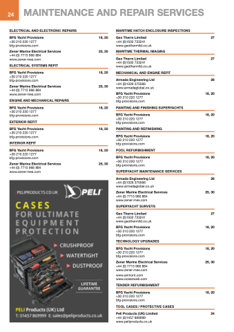 24 MAINTENANCE AND REPAIR SERVICES ELECTRICAL AND ELECTRONIC REPAIRS BFG Yacht Provisions +30 210 220 1277 bfg-provisions.com Zener Marine Electrical Services +44 (0) 7715 966 884 www.zener-mes.com ELECTRICAL SYSTEMS REFIT BFG Yacht Provisions +30 210 220 1277 bfg-provisions.com Zener Marine Electrical Services +44 (0) 7715 966 884 www.zener-mes.com ENGINE AND MECHANICAL REPAIRS BFG Yacht Provisions +30 210 220 1277 bfg-provisions.com EXTERIOR REFIT BFG Yacht Provisions +30 210 220 1277 bfg-provisions.com INTERIOR REFIT BFG Yacht Provisions +30 210 220 1277 bfg-provisions.com Zener Marine Electrical Services +44 (0) 7715 966 884 www.zener-mes.com 18, 20 25, 30 18, 20 25, 30 18, 20 18, 20 18, 20 25, 30 MARITIME HATCH ENCLOSURE INSPECTIONS Geo Therm Limited +44 (0)1502 723241 www.geothermltd.co.uk MARITIME THERMAL IMAGING Geo Therm Limited +44 (0)1502 723241 www.geothermltd.co.uk MECHANICAL AND ENGINE REFIT Armada Engineering Ltd +44 (0)1326 375566 www.armadaglobal.co.uk BFG Yacht Provisions +30 210 220 1277 bfg-provisions.com PAINTING AND FINISHING SUPERYACHTS BFG Yacht Provisions +30 210 220 1277 bfg-provisions.com PAINTING AND REFINISHING BFG Yacht Provisions +30 210 220 1277 bfg-provisions.com POOL REFURBISHMENT BFG Yacht Provisions +30 210 220 1277 bfg-provisions.com SUPERYACHT MAINTENANCE SERVICES Armada Engineering Ltd +44 (0)1326 375566 www.armadaglobal.co.uk Zener Marine Electrical Services +44 (0) 7715 966 884 www.zener-mes.com SUPERYACHT SURVEYS Geo Therm Limited +44 (0)1502 723241 www.geothermltd.co.uk BFG Yacht Provisions +30 210 220 1277 bfg-provisions.com TECHNOLOGY UPGRADES BFG Yacht Provisions +30 210 220 1277 bfg-provisions.com Zener Marine Electrical Services +44 (0) 7715 966 884 www.zener-mes.com www.airmont.com www.oceanweb.com TENDER REFURBISHMENT BFG Yacht Provisions +30 210 220 1277 bfg-provisions.com TOOL CASES / PROTECTIVE CASES Peli Products (UK) Limited +44 (0)1457 869999 www.peliproducts.co.uk 27 27 26 18, 20 18, 20 18, 20 18, 20 26 25, 30 27 18, 20 18, 20 25, 30 18, 20 24