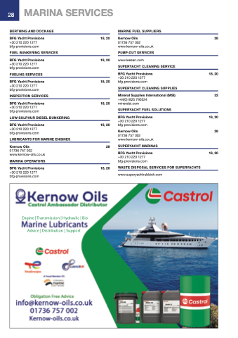 28 MARINA SERVICES BERTHING AND DOCKAGE BFG Yacht Provisions +30 210 220 1277 bfg-provisions.com FUEL BUNKERING SERVICES BFG Yacht Provisions +30 210 220 1277 bfg-provisions.com FUELING SERVICES BFG Yacht Provisions +30 210 220 1277 bfg-provisions.com INSPECTION SERVICES BFG Yacht Provisions +30 210 220 1277 bfg-provisions.com LOW-SULPHUR DIESEL BUNKERING BFG Yacht Provisions +30 210 220 1277 bfg-provisions.com LUBRICANTS FOR MARINE ENGINES 18, 20 18, 20 18, 20 18, 20 18, 20 MARINE FUEL SUPPLIERS Kernow Oils 28 01736 757 002 www.kernow-oils.co.uk PUMP-OUT SERVICES www.leesan.com SUPERYACHT CLEANING SERVICE BFG Yacht Provisions +30 210 220 1277 bfg-provisions.com SUPERYACHT CLEANING SUPPLIES 18, 20 Mineral Supplies International (MSI) 32 +44(0)1825 790524 mineralsi.com SUPERYACHT FUEL SOLUTIONS BFG Yacht Provisions +30 210 220 1277 bfg-provisions.com 18, 20 Kernow Oils 28 01736 757 002 www.kernow-oils.co.uk SUPERYACHT MARINAS BFG Yacht Provisions +30 210 220 1277 bfg-provisions.com WASTE DISPOSAL SERVICES FOR SUPERYACHTS www.superyachtrubbish.com 01736 757 002 www.kernow-oils.co.uk MARINA OPERATORS BFG Yacht Provisions +30 210 220 1277 bfg-provisions.com 18, 20 Kernow Oils 28 18, 20 Engine | Transmission | Hydraulic | Bio Advice | Distribution | Support