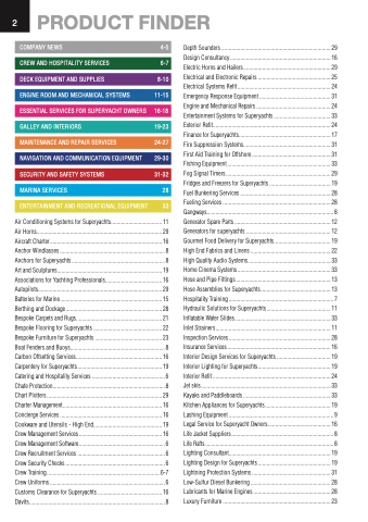 2 PRODUCT FINDER COMPANY NEWS 4-5 Depth Sounders 29 Design Consultancy 16 Electric Horns and Hailers 29 Electrical and Electronic Repairs 25 Electrical Systems Refit 24 Emergency Response Equipment 31 Engine and Mechanical Repairs 24 Entertainment Systems for Superyachts 33 Exterior Refit 24 Finance for Superyachts 17 Fire Suppression Systems 31 First Aid Training for Offshore 31 Fishing Equipment 33 Fog Signal Timers29 Fridges and Freezers for Superyachts 19 Fuel Bunkering Services 28 Fueling Services 28 Gangways 8 Generator Spare Parts 12 Generators for superyachts 12 Gourmet Food Delivery for Superyachts 19 High End Fabrics and Linens 22 High Quality Audio Systems 33 Home Cinema Systems 33 Hose and Pipe Fittings 13 Hose Assemblies for Superyachts 13 Hospitality Training 7 Hydraulic Solutions for Superyachts 11 Inflatable Water Slides 33 Inlet Strainers 11 Inspection Services 28 Insurance Services 16 Interior Design Services for Superyachts 19 Interior Lighting for Superyachts 19 Interior Refit 24 Jet skis 33 Kayaks and Paddleboards 33 Kitchen Appliances for Superyachts 19 Lashing Equipment 9 Legal Service for Superyacht Owners 16 Life Jacket Suppliers 8 Life Rafts 8 Lighting Consultant 19 Lighting Design for Superyachts 19 Lightning Protection Systems 31 Low-Sulfur Diesel Bunkering 28 Lubricants for Marine Engines 28 Luxury Furniture 23 CREW AND HOSPITALITY SERVICES 6-7 DECK EQUIPMENT AND SUPPLIES 8-10 ENGINE ROOM AND MECHANICAL SYSTEMS 11-15 ESSENTIAL SERVICES FOR SUPERYACHT OWNERS 16-18 GALLEY AND INTERIORS 19-23 MAINTENANCE AND REPAIR SERVICES 24-27 NAVIGATION AND COMMUNICATION EQUIPMENT 29-30 SECURITY AND SAFETY SYSTEMS 31-32 MARINA SERVICES 28 ENTERTAINMENT AND RECREATIONAL EQUIPMENT 33 Air Conditioning Systems for Superyachts 11 Air Horns 29 Aircraft Charter 16 Anchor Windlasses 8 Anchors for Superyachts 8 Art and Sculptures 19 Associations for Yachting Professionals 16 Autopilots 29 Batteries for Marine 15 Berthing and Dockage 28 Bespoke Carpets and Rugs 21 Bespoke Flooring for Superyachts 22 Bespoke Furniture for Superyachts 23 Boat Fenders and Buoys 8 Carbon Offsetting Services 16 Carpentery for Superyachts19 Catering and Hospitality Services 6 Chafe Protection 8 Chart Plotters 29 Charter Management 16 Concierge Services 16 Cookware and Utensils - High End 19 Crew Management Services 16 Crew Management Software 6 Crew Recruitment Services 6 Crew Security Checks 6 Crew Training6-7 Crew Uniforms 6 Customs Clearance for Superyachts 16 Davits 8