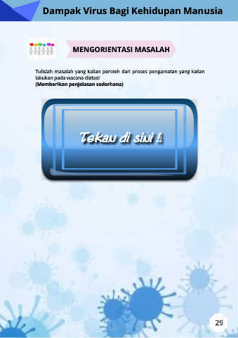 Dampak Virus Bagi Kehidupan Manusia MENGORIENTASI MASALAH Tulislah masalah yang kalian peroleh dari proses pengamatan yang kalian lakukan pada wacana diatas! (Memberikan penjelasan sederhana) 29