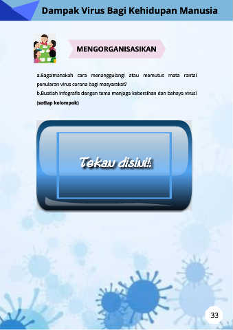 Dampak Virus Bagi Kehidupan Manusia MENGORGANISASIKAN a.Bagaimanakah cara menanggulangi atau memutus mata rantai penularan virus corona bagi masyarakat? b.Buatlah infografis dengan tema menjaga kebersihan dan bahaya virus! (setiap kelompok) 33