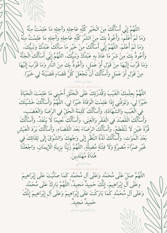 اﻟ ﱠﻠﻬﻢ ا ّﻧ اﺳﺎ ُﻟ َﻚ ﻣﻦ ا ْﻟﺨَﻴ ِﺮ ﻛ ّﻠﻪ ﻋﺎ ِﺟﻠﻪ وآ ِﺟﻠﻪ ﻣﺎ ﻋﻠﻤﺖ ﻣﻨْﻪ