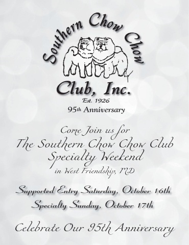 Come Join us for The Southern Chow Chow Club Specialty Weekend in West Friendship, MD Supported Entry Saturday, October 16th Specialty Sunday, October 17th Celebrate Our 95th Anniversary