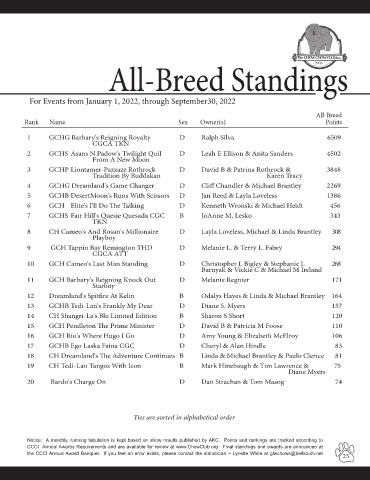 Notice: A monthly, running tabulation is kept based on show results published by AKC. Points and rankings are tracked according to