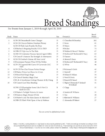 Notice: A monthly, running tabulation is kept based on show results published by AKC. Points and rankings are tracked according to CCCI