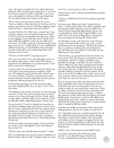 ing blood and rabbit skins on our front porch. You'll You've subjected your dog to unsupervised therapy