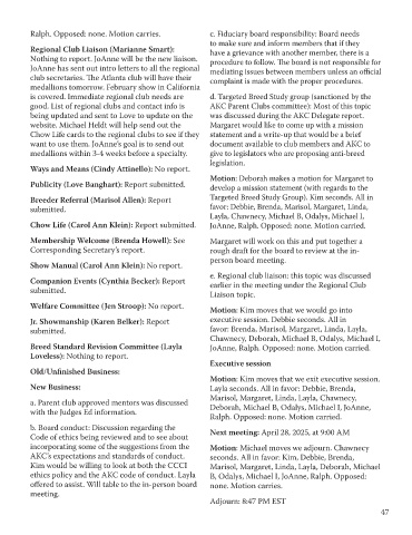ethics policy and the AKC code of conduct. Layla B, Odalys, Michael I, JoAnne, Ralph. Opposed: