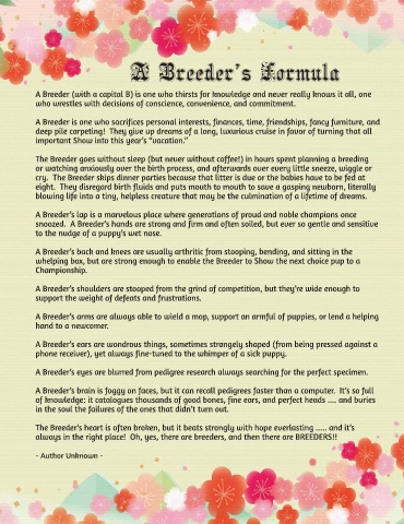 cry. The Breeder skips dinner parties because that litter is due or the babies have to be fed at