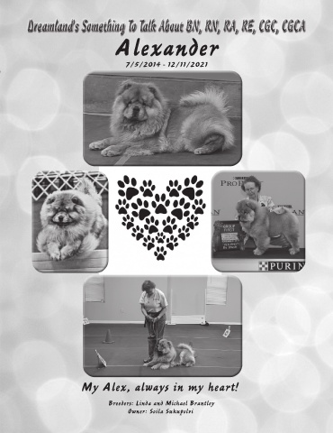 Dreamland's Something To Talk About BN, RN, RA, RE, CGC, CGCA Alexander 7/5/2014 - 12/11/2021 My Alex, always in my heart! Breeders: Linda and Michael Brantley Owner: Soila Sukupolvi