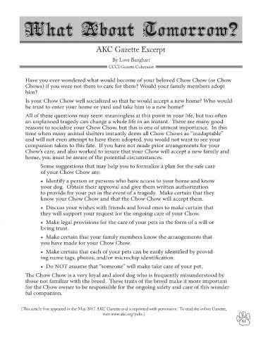 Chow’s care, and also worked to insure that your Chow will accept a new family and