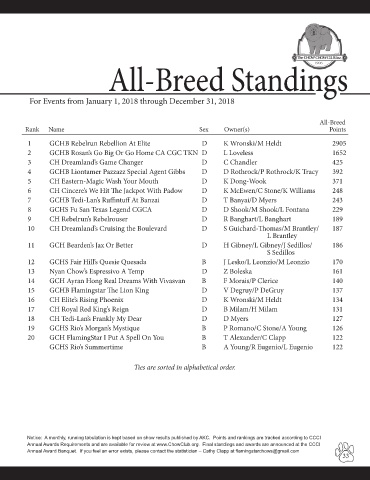 Notice: A monthly, running tabulation is kept based on show results published by AKC. Points and rankings are tracked according to CCCI