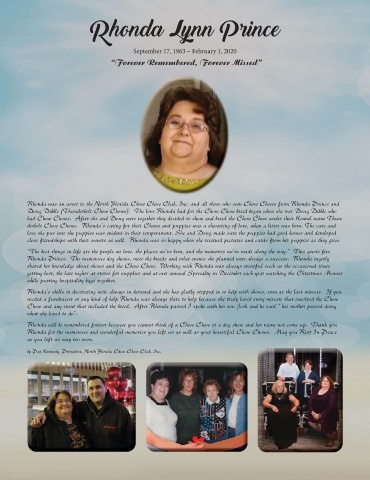 Rhonda was an asset to the North Florida Chow Chow Club, Inc. and all those who own Chow Chows from Rhonda Prince and