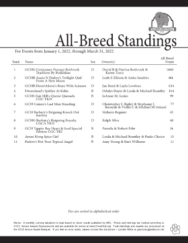 Notice: A monthly, running tabulation is kept based on show results published by AKC. Points and rankings are tracked according to