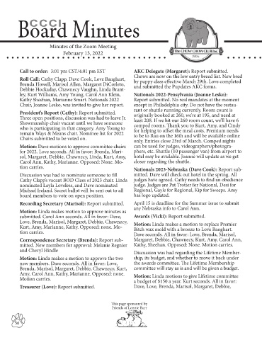 Roll Call: Cathy Clapp, Dave Cook, Love Banghart, Chows are now on the low entry breed list. New bred