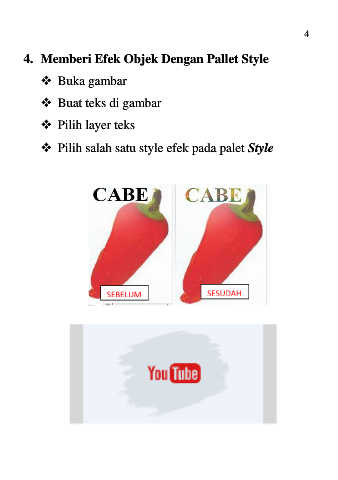 4 4. Memberi Efek Objek Dengan Pallet Style Buka gambar Buat teks di gambar Pilih layer teks Pilih salah satu style efek pada palet Style SEBELUM SESUDAH