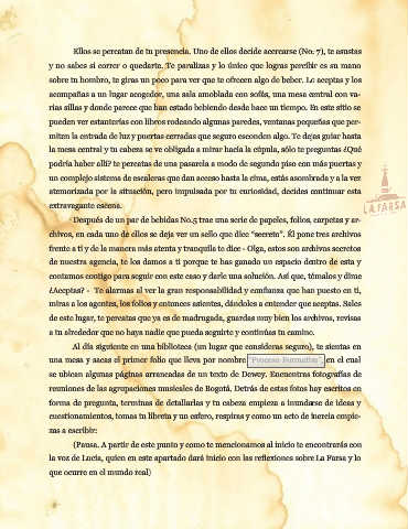 la voz de Lucía, quien en este apartado dará inicio con las reflexiones sobre La Farsa y lo