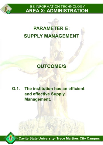 BS INFORMATION TECHNOLOGY AREA X: ADMINISTRATION PARAMETER E: SUPPLY MANAGEMENT OUTCOME/S O.1. The institution has an efficient and effective Supply Management. Cavite State University- Trece Martires City Campus