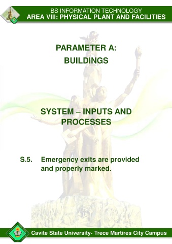 BS INFORMATION TECHNOLOGY AREA VIII: PHYSICAL PLANT AND FACILITIES PARAMETER A: BUILDINGS SYSTEM – INPUTS AND PROCESSES S.5. Emergency exits are provided and properly marked. Cavite State University- Trece Martires City Campus