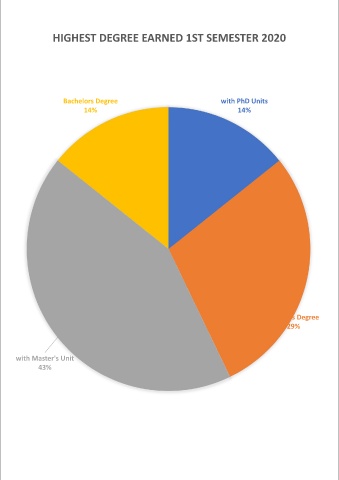 HIGHEST DEGREE EARNED 1ST SEMESTER 2020 Bachelors Degree with PhD Units 14% 14% Master's Degree 29% with Master's Unit 43%