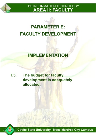 BS INFORMATION TECHNOLOGY AREA II: FACULTY PARAMETER E: FACULTY DEVELOPMENT IMPLEMENTATION I.5. The budget for faculty development is adequately allocated. Cavite State University- Trece Martires City Campus
