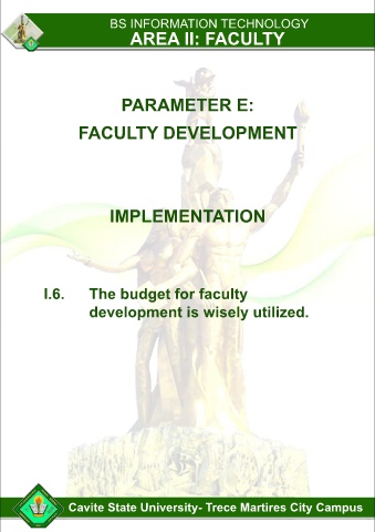 BS INFORMATION TECHNOLOGY AREA II: FACULTY PARAMETER E: FACULTY DEVELOPMENT IMPLEMENTATION I.6. The budget for faculty development is wisely utilized. Cavite State University- Trece Martires City Campus