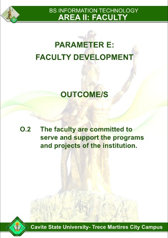 BS INFORMATION TECHNOLOGY AREA II: FACULTY PARAMETER E: FACULTY DEVELOPMENT OUTCOME/S O.2 The faculty are committed to serve and support the programs and projects of the institution. Cavite State University- Trece Martires City Campus
