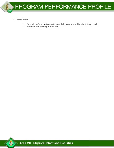 PROGRAM PERFORMANCE PROFILE 3. OUTCOMES ➢ Present and/or show in pictorial form that indoor and outdoor facilities are well- equipped and properly maintained. Area VIII: Physical Plant and Facilities