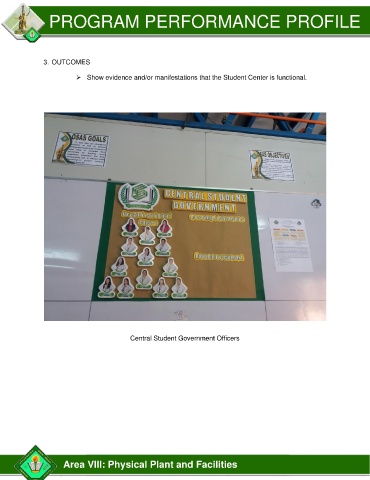PROGRAM PERFORMANCE PROFILE 3. OUTCOMES ➢ Show evidence and/or manifestations that the Student Center is functional. Central Student Government Officers Area VIII: Physical Plant and Facilities