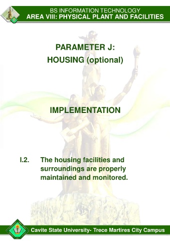 BS INFORMATION TECHNOLOGY AREA VIII: PHYSICAL PLANT AND FACILITIES PARAMETER J: HOUSING (optional) IMPLEMENTATION I.2. The housing facilities and surroundings are properly maintained and monitored. Cavite State University- Trece Martires City Campus