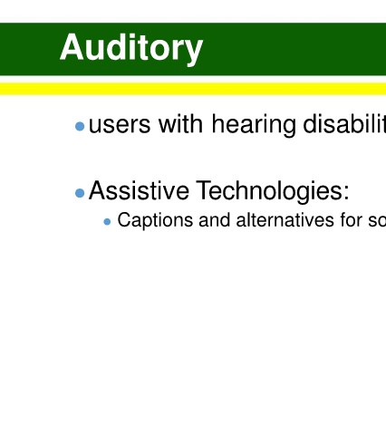 Auditory ●users with hearing disabilities ●Assistive Technologies: ● Captions and alternatives for sound-necessary media