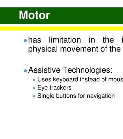 Motor ●has limitation in the independent or purposeful physical movement of the body ●Assistive Technologies: ● Uses keyboard instead of mouse ● Eye trackers ● Single buttons for navigation