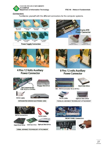 CAVITE STATE UNIVERSITY T3 CAMPUS Department of Information Technology ITEC 90 – Network Fundamentals Connectors Familiarize yourself with the different connectors for the computer systems. 27