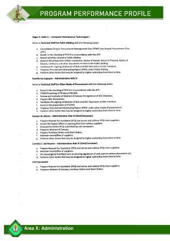 PROGRAM PERFORMANCE PROFILE Area X: Administration
