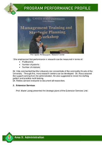 Prof. Mariel Lising presented the strategic plans of the Extension Services Unit.