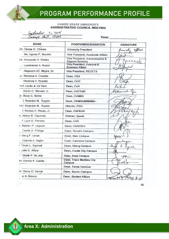 PROGRAM PERFORMANCE PROFILE Area X: Administration