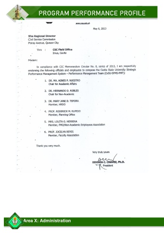 PROGRAM PERFORMANCE PROFILE Area X: Administration