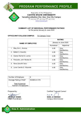 SUMMARY LIST OF INDIVIDUAL PERFORMANCE RATINGS