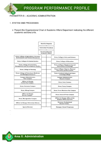 PROGRAM PERFORMANCE PROFILE PARAMETER B – ACADEMIC ADMINISTRATION 1. SYSTEM AND PROCESSES ➢ Present the Organizational Chart of Academic Affairs Department indicating the different academic sections/units. Area X: Administration