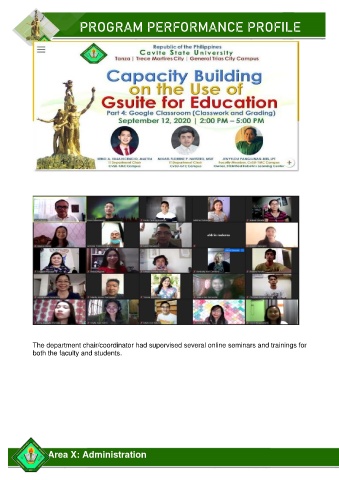PROGRAM PERFORMANCE PROFILE The department chair/coordinator had supervised several online seminars and trainings for both the faculty and students. Area X: Administration