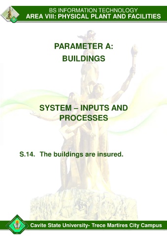 BS INFORMATION TECHNOLOGY AREA VIII: PHYSICAL PLANT AND FACILITIES PARAMETER A: BUILDINGS SYSTEM – INPUTS AND PROCESSES S.14. The buildings are insured. Cavite State University- Trece Martires City Campus