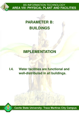 BS INFORMATION TECHNOLOGY AREA VIII: PHYSICAL PLANT AND FACILITIES PARAMETER B: BUILDINGS IMPLEMENTATION I.4. Water facilities are functional and well-distributed in all buildings. Cavite State University- Trece Martires City Campus