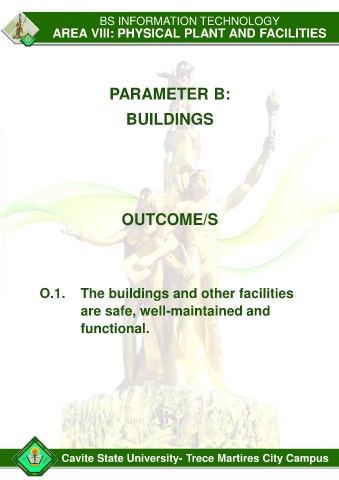 BS INFORMATION TECHNOLOGY AREA VIII: PHYSICAL PLANT AND FACILITIES PARAMETER B: BUILDINGS OUTCOME/S O.1. The buildings and other facilities are safe, well-maintained and functional. Cavite State University- Trece Martires City Campus