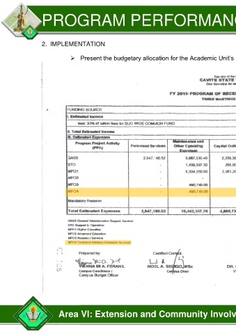 PROGRAM PERFORMANCE PROFILE 2. IMPLEMENTATION ➢ Present the budgetary allocation for the Academic Unit’s Extension Program in the last 3-5 years. Area VI: Extension and Community Involvement