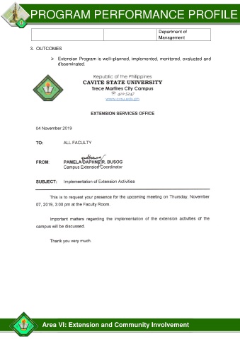 PROGRAM PERFORMANCE PROFILE Department of Management 3. OUTCOMES ➢ Extension Program is well–planned, implemented, monitored, evaluated and disseminated. Area VI: Extension and Community Involvement