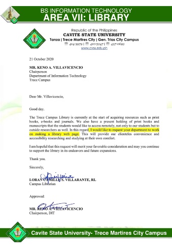 BS INFORMATION TECHNOLOGY AREA VII: LIBRARY Cavite State University- Trece Martires City Campus