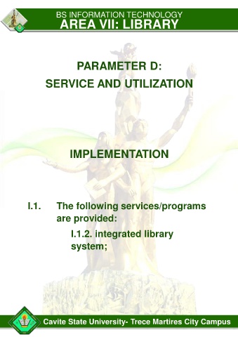 BS INFORMATION TECHNOLOGY AREA VII: LIBRARY PARAMETER D: SERVICE AND UTILIZATION IMPLEMENTATION I.1. The following services/programs are provided: I.1.2. integrated library system; Cavite State University- Trece Martires City Campus